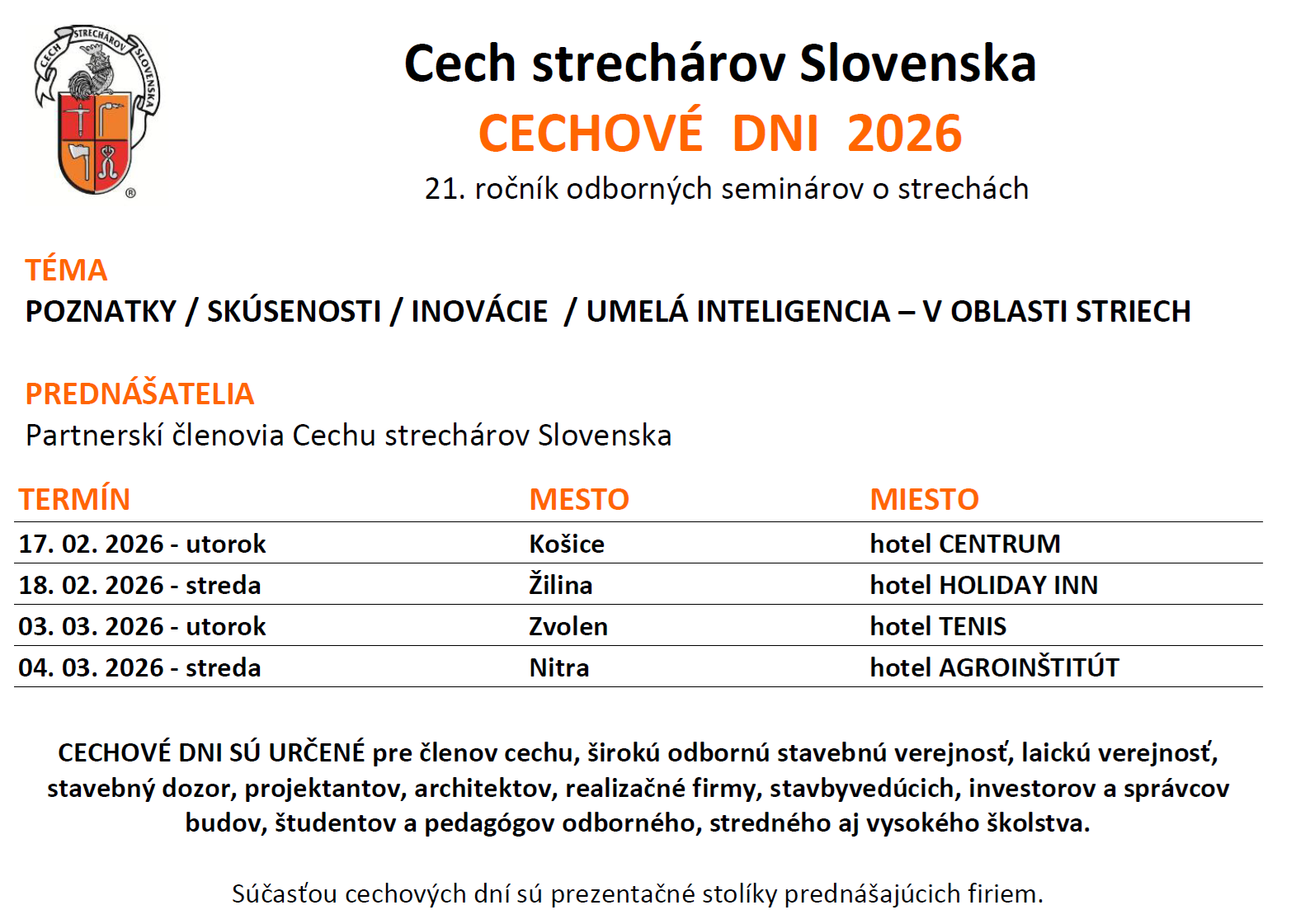 CECHOVÉ DNI sú odborným podujatím určeným pre členov Cechu strechárov Slovenska (CSS), ako aj pre širokú odbornú verejnosť.